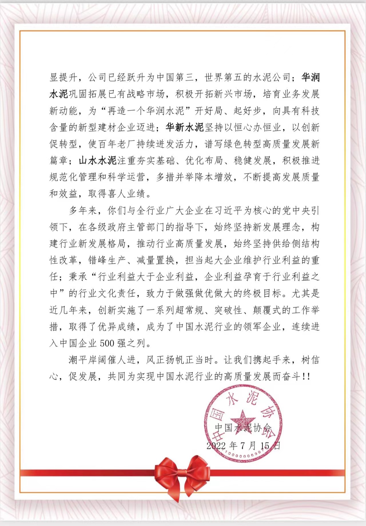 中國(guó)水泥協(xié)會(huì)賀信